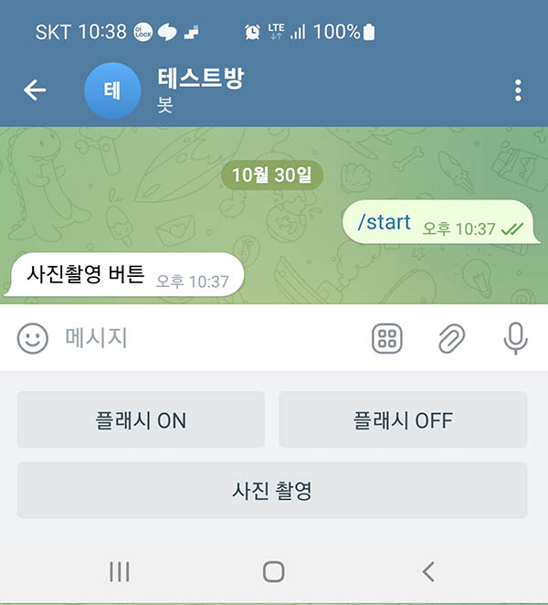7. 텔레그램에서 /start를 누르면 촬영에 필요한 버튼이 만들어 집니다.