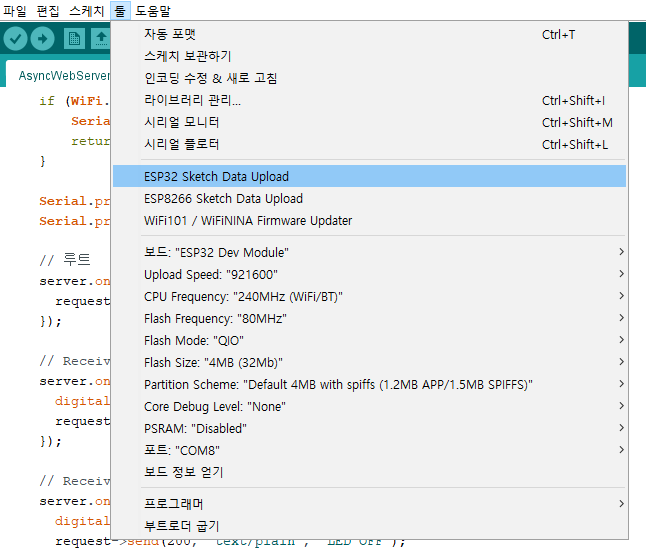 4. 아두이노 IDE를 실행하고 메뉴에서 '툴->ESP32 Sketch Data Upload'를 클릭 합니다.