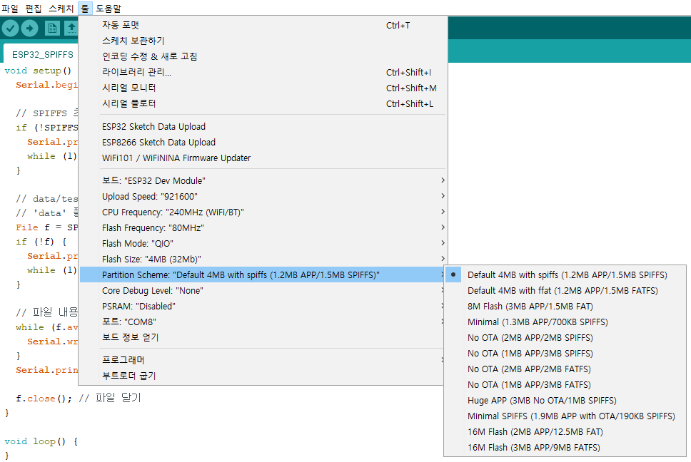 ESP32에서는 내부의 플래시 메모리의 일부를 PC의 하드디스크와 같이 파일을