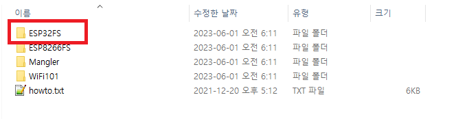 2. 압축을 풀어 'ESP32FS' 폴더를 IDE가 설치된 디렉토리로 이동하여 'tools' 폴더에 붙여넣기 합니다.