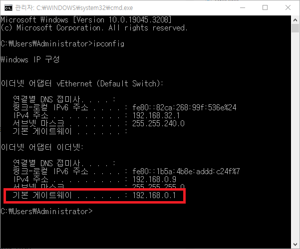 기본 게이트웨이 주소가 '192.168.0.1' 또는 '192.168.1.1'등 사용자의 환경에 따라 다르게 나옵니다.