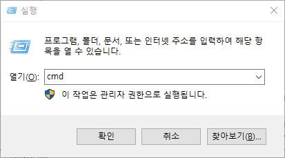 키보드의 '윈도우키+R'을 눌러 'cmd'를 입력합니다.