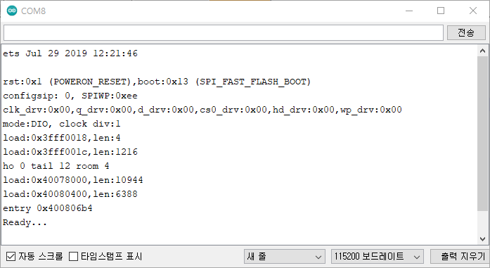 디버깅을 위해 시리얼창으로 연결하여 보면 ESP32 모듈이 부팅시 알 수 없는 메시지가